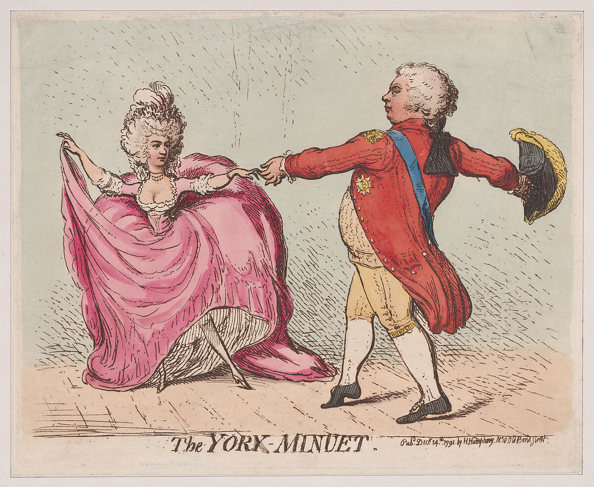 Caricature showing the Duchess of York (Frederica Charlotte Ulrica Catherine of Prussia) dancing with the Duke of York, apparently referring to their recent marriage. The Duchess was known for her small feet.