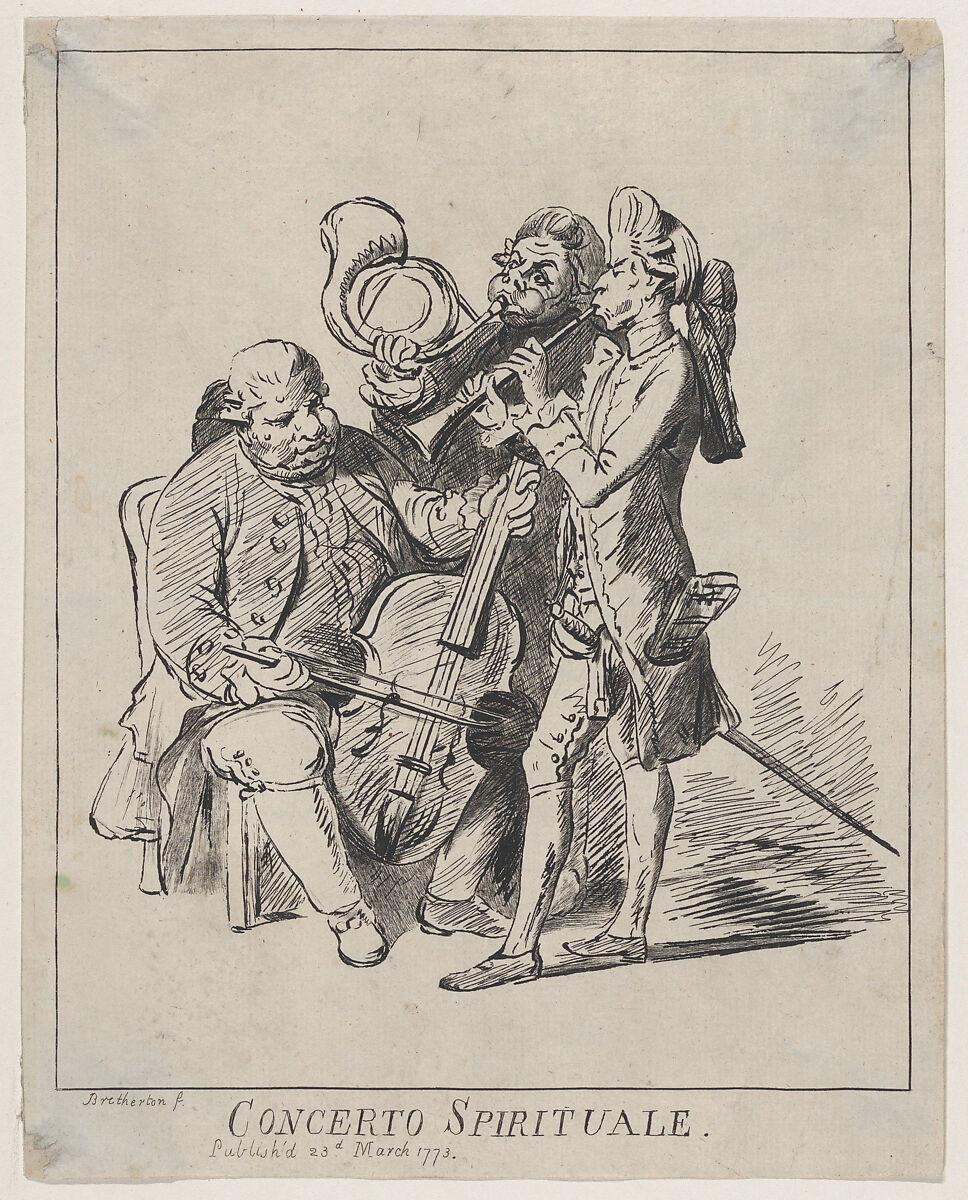 Concerts of religious music were performed regularly at the Theatre Royal, Covent Garden in the 1770s. Bunbury's name does not appear on this caricature, but he is credited as designer in later variations (17.3.888-222 and 59.533.1738). The viol da gamba player likely represents Carl Friedrich Abel, or possibly Johann Christian Bach. The oboe player has been identified as Johann Christian Fisher, and the French horn player as Giovanni Punto (born Jan Stich). These men came to London from the Continent hoping to take advantage of the patronage of George III–the British king was also prince-elector of Hanover, married Charlotte of Mecklenburg-Strelitz, and enjoyed German music.