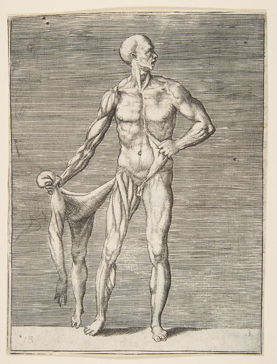 - Title: Flayed man seen from the front, holding the skin of his right arm and leg