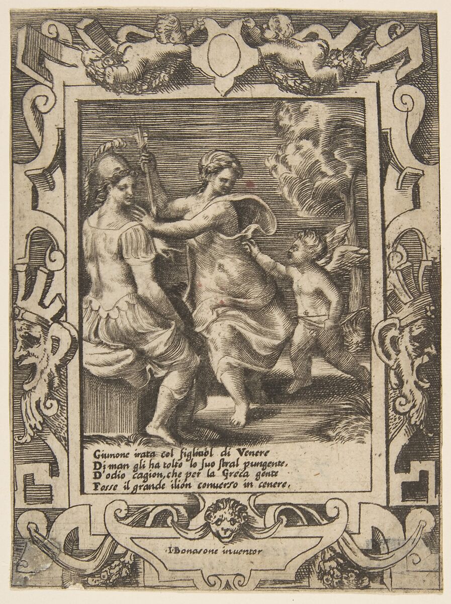 - Title:Athena seated near Juno who has taken away Cupid's arrows, set within an elaborate frame, from "Loves, Rages and Jealousies of Juno"