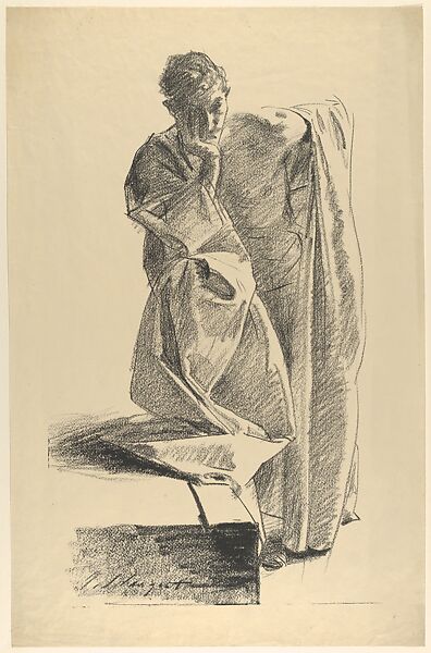 As he worked on a group of six lithographs in 1895, Sargent moved away from images that silhouetted nude forms against light grounds, and added drapery to increase the amount of tone and texture. The standing model is swathed in a heavy sheet, which crumples into dark and light folds below his propped knee, and falls in strong verticals below his raised left elbow. Strong tonal contrasts would be developed fully in "Study of a Young Man, Seated" (50.558.4), the print Sargent sent to the Paris Palais des Beaux-Arts exhibition of October 1895. The British printer Frederick Goulding, who had developed an improved transfer paper for lithography, encouraged Sargent and other London artists to participate, offering to supply them with materials and to print their work. Sargent's valet, Nicola d’Inverno, a Londoner of Italian descent, is believed to have served as model.
