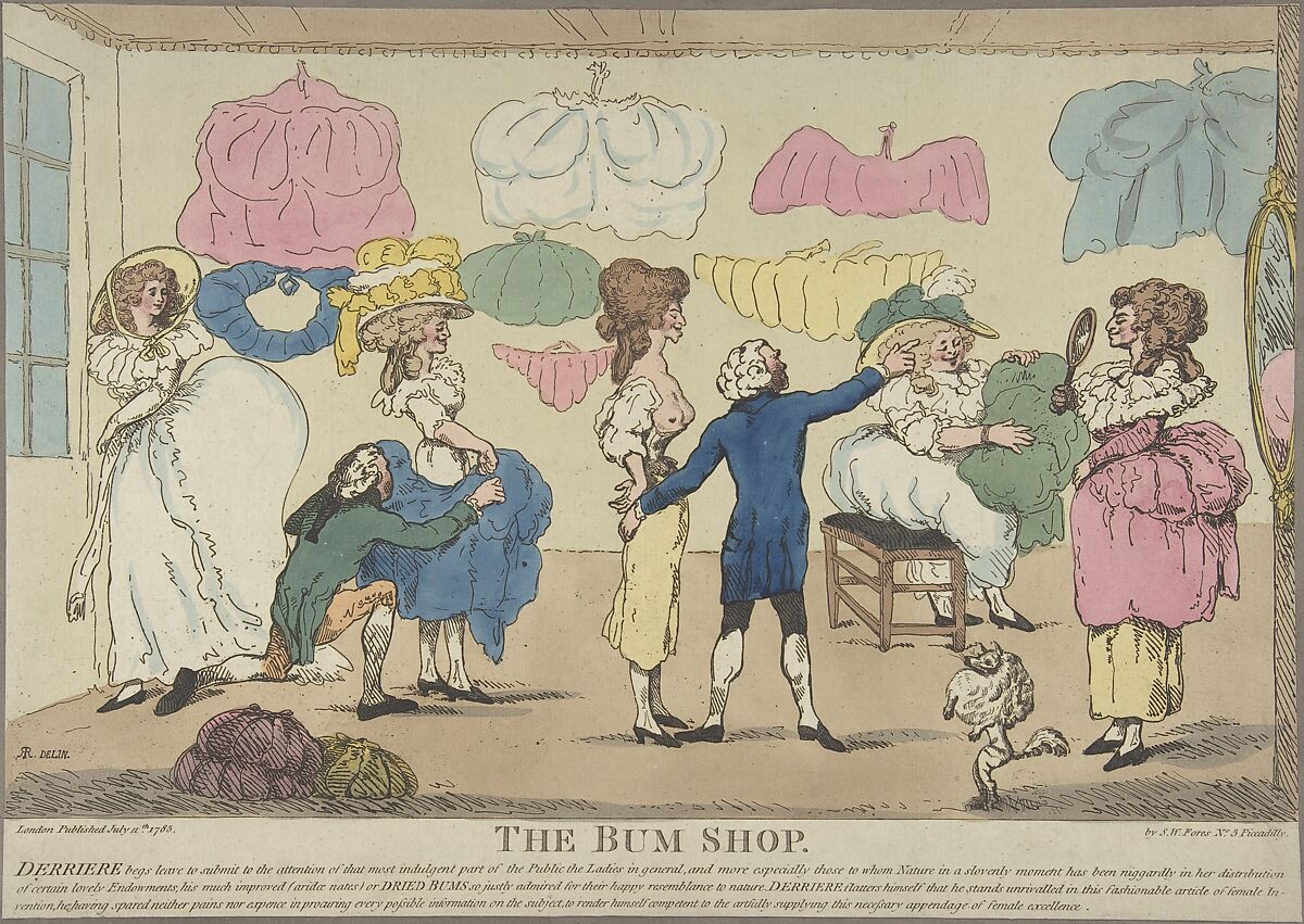 By the 1780s the London fashion for high hair had been replaced by an exaggerated female silhouette that featured an inflated bust and enlarged rump, both achieved with the help of props. In this print, fashionable women visit a “Bum Shop” to buy bustles and are shown trying on various models. A young woman by the door in white, who has achieved the desired effect, prepares to leave. The facetious text below, written by the proprietor “Derriere,” assures ladies “to whom Nature in a slovenly moment has been niggardly in her distribution of certain lovely Endowments” that he has become expert at “artfully supplying this necessary appendage of female excellence." A small poodle clipped to imitate the fashion underscores the satirical tone.