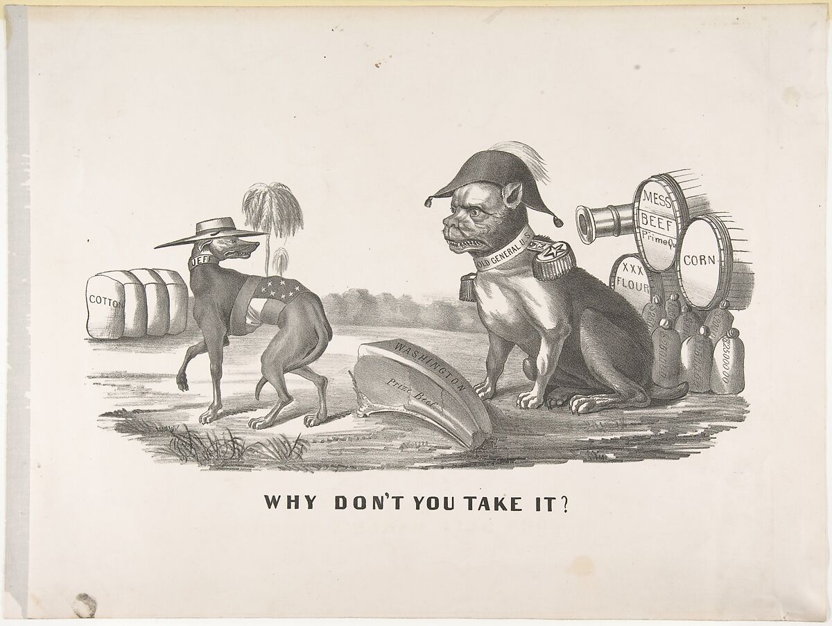 Currier & Ives produced many political satires during the Civil War. This example caricatures the Confederate leader Jefferson Davis, shown as a greyhound, who cringes away from an aggressive bulldog representing the Northern general Ulysses S. Grant. Between them sits a piece of "Prize beef" labeled "Washington."