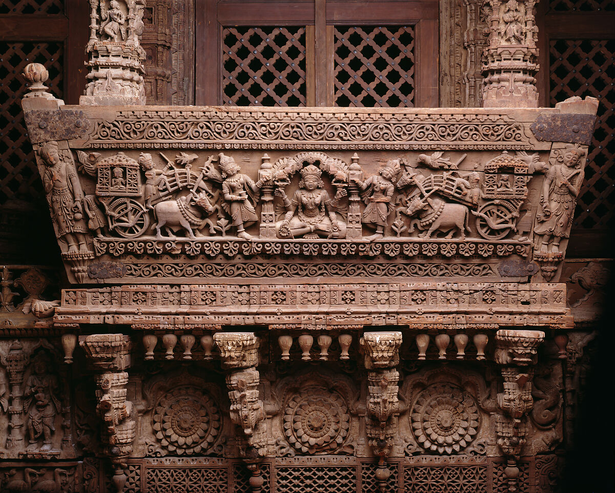 This particularly fine and elaborate early Gujarati wood carving is the type that was translated into stone by craftsmen of the great Mughal emperor Akbar in the sixteenth century on some buildings at Fatehpur-Sikri (City of Victory) and at the harem at the Red Fort in Agra.