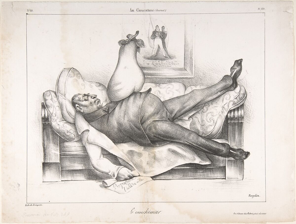 The marquis de Lafayette, famous for his participation in the American Revolution, had aspired to head the French government during the days of the July Revoution of 1830. He eventually agreed to give up his republican aspirations and support Louis-Philippe as king. An iconic moment of reconciliation came when he and Louis embraced before a crowd on the balcony of the Hôtel de Ville in Paris. By the end of 1832, however, the liberal Lafayette and much of the country had come to regret their support of the increasingly conservative monarch. Daumier depicts the marquis tormented by his support of the king, who is embodied by the pear weighing down on his chest. He holds a sheet of paper inscribed "Programme de l'hotel de ville" as he lies in front of an image of the famous embrace. Daumier derived the composition - Lafayette lying on a couch with his arm draped over the side and the tormentor of his dream sitting on his stomach -- from Henry Fuseli's famous painting The Nightmare (1781; Detroit Institute of Arts). The print is signed with the artist's pseudonym, "Rogelin."