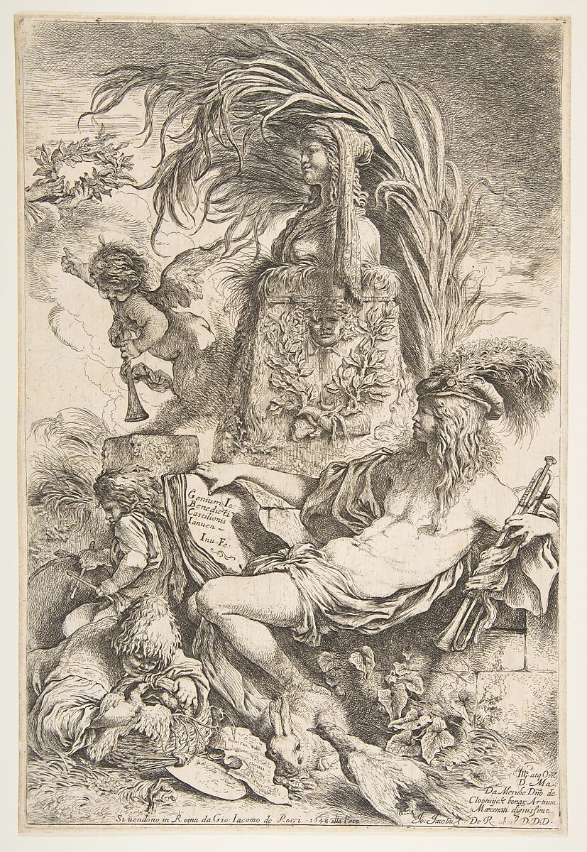 In Castiglione’s most famous etching, a reclining figure holds a book inscribed: “The genius of Giovanni Benedetto Castiglione of Genoa [who] invented and made [this].” The print was published in Rome in 1648 by Gian Giacomo de’ Rossi, who dedicated it to Matthijs van de Merwede, a Dutch nobleman who spent time in Italy between 1647 and 1650. The figure is not a self-portrait of the artist; the composition refers to artistic fame in a general sense. The many details are rich with meaning. For example, fecundity is represented by the basket of poultry and the rabbit, and creativity by the artist’s palette and the sheet of music.