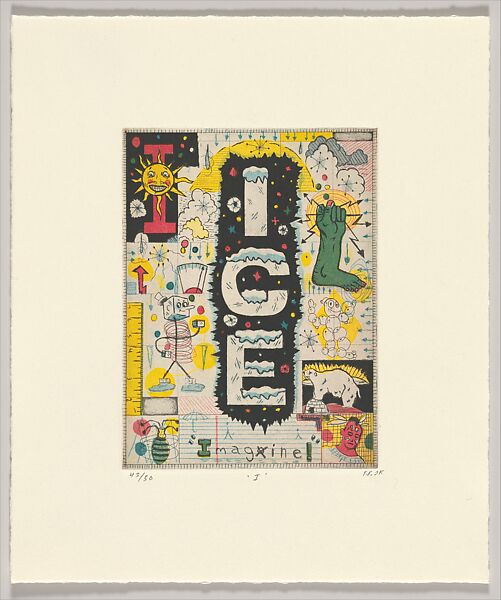 For Max and Gaby’s Alphabet, Fitzpatrick created twenty-six etchings, each corresponding to a single letter of the alphabet. Inspired by suggestions made by his children, Max and Gaby, Fitzpatrick filled each page with multiple objects or figures that begin with each letter. "A," for instance, contains the form of an atom in the center, below which is a small atomic-bomb cloud, while above is a rocket presumably carrying an astronaut into space, perhaps representing both positive and negative potentials of this discovery. The prints use bold, contrasting colors and combine playful forms that make reference to myriad subjects including superheroes, fantastical animals, comics, both science and science fiction, and everyday life. With experience in writing, tattooing, printmaking, and working in numerous other art forms, Fitzpatrick provides an abundance of details and witty juxtapositions, and creates a work that appeals to both adults and children.