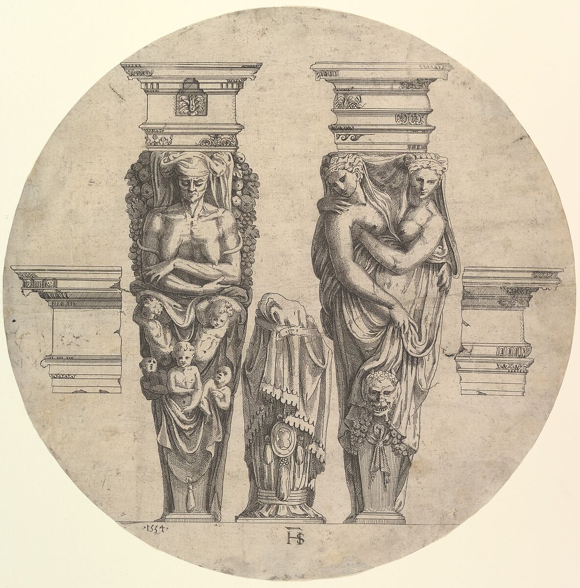 Print with five designs, characterized by two large designs for terms placed side by side. The term on the left shows the nude upper body of an old woman supporting the capital or cornice, and five children or putti covering the base. The term on the right is made up out of two embracing women who are partly covered by a piece of drapery. On the outside the terms are flanked by two variations on the composition of a cornice. Between the two terms a half-lenght design for a pillar is placed, covered by a piece of drapery held in place by a belt.