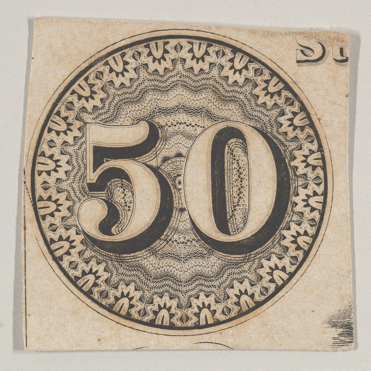 Banknote motif: the number 50 against an ornamental lathe work rondel resembling lace