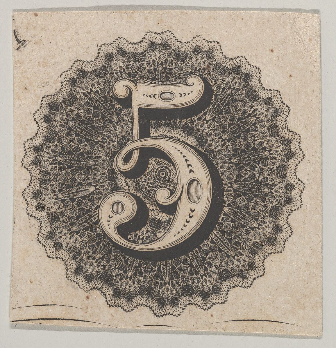 - Title: Banknote motif: number 5 against a circular panel of lace-like lathe work with a scalloped edge
