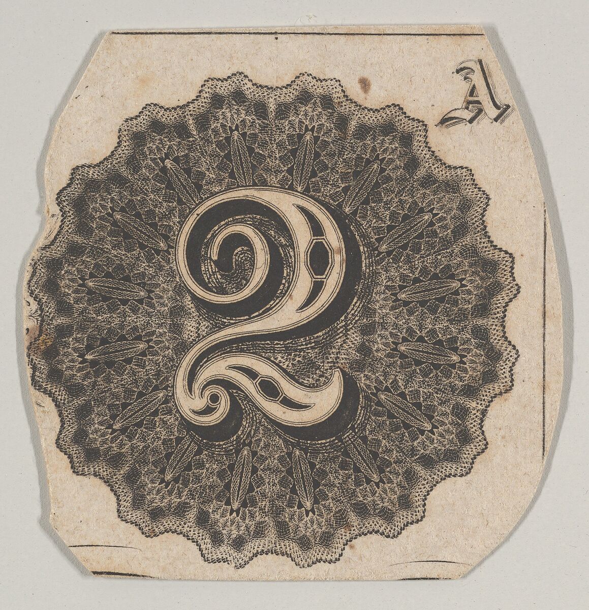 Banknote motif: number 2 against a circular panel of lathe work with a scalloped edge