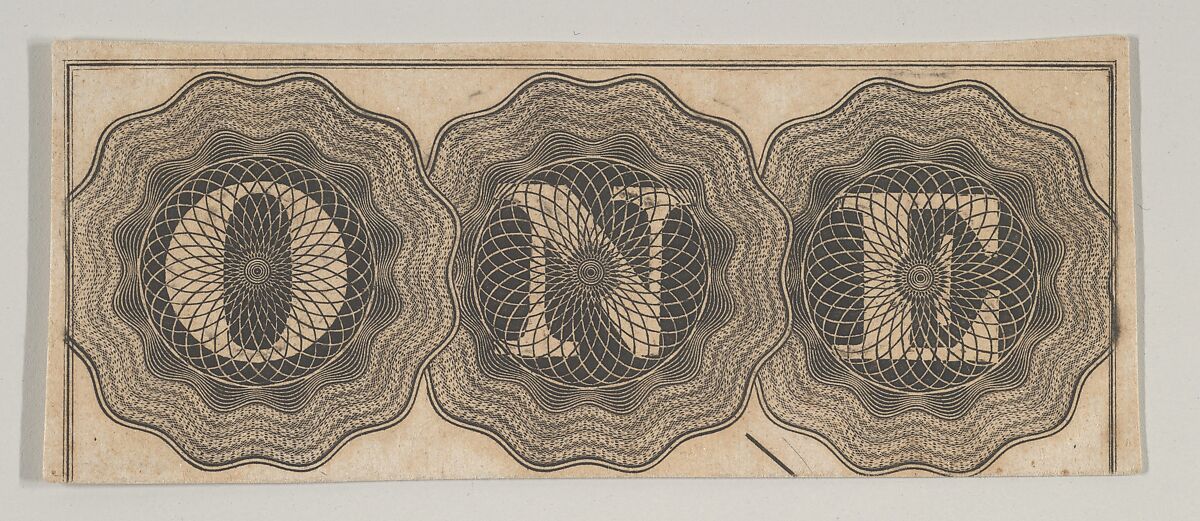- Title: Banknote motif: the word ONE with each letter set against a circle of lathe work