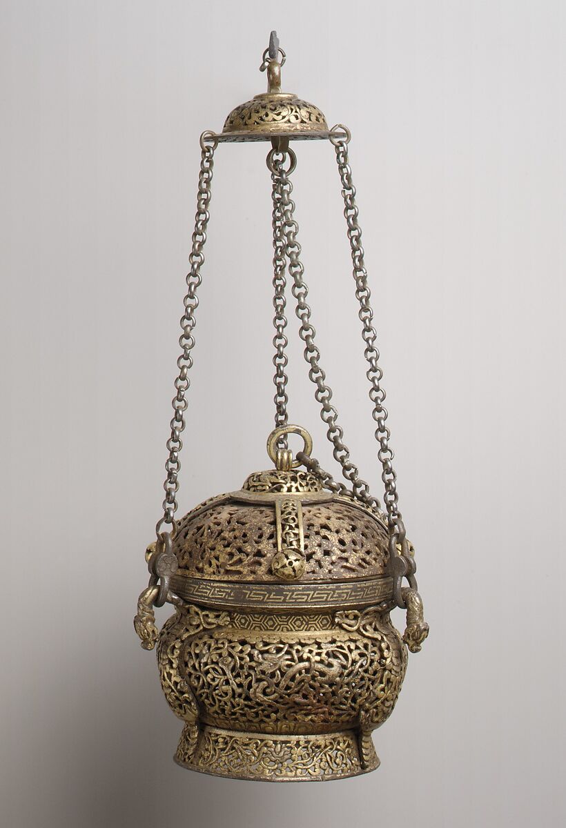 Tibetan metalsmiths were especially renowned for working in iron, typically with intricate openwork designs heightened with inlaid precious metals. Here gold was applied to the foliate lotus design with intertwined dragons and damascened to create the key and lozenge bands on the rims.