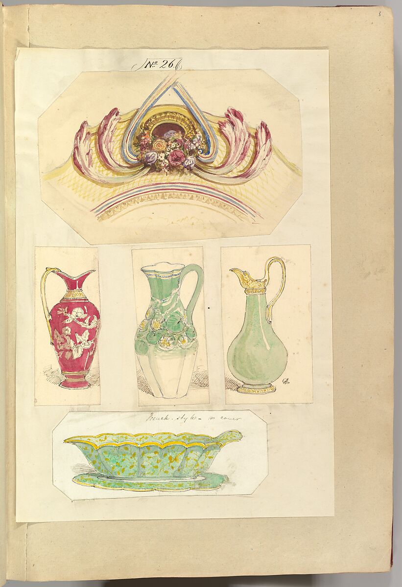 - Title: Designs for an Pierced Border Ornament, Three Pitchers and an Open Basin (recto); Design for a Candle Stick (verso)