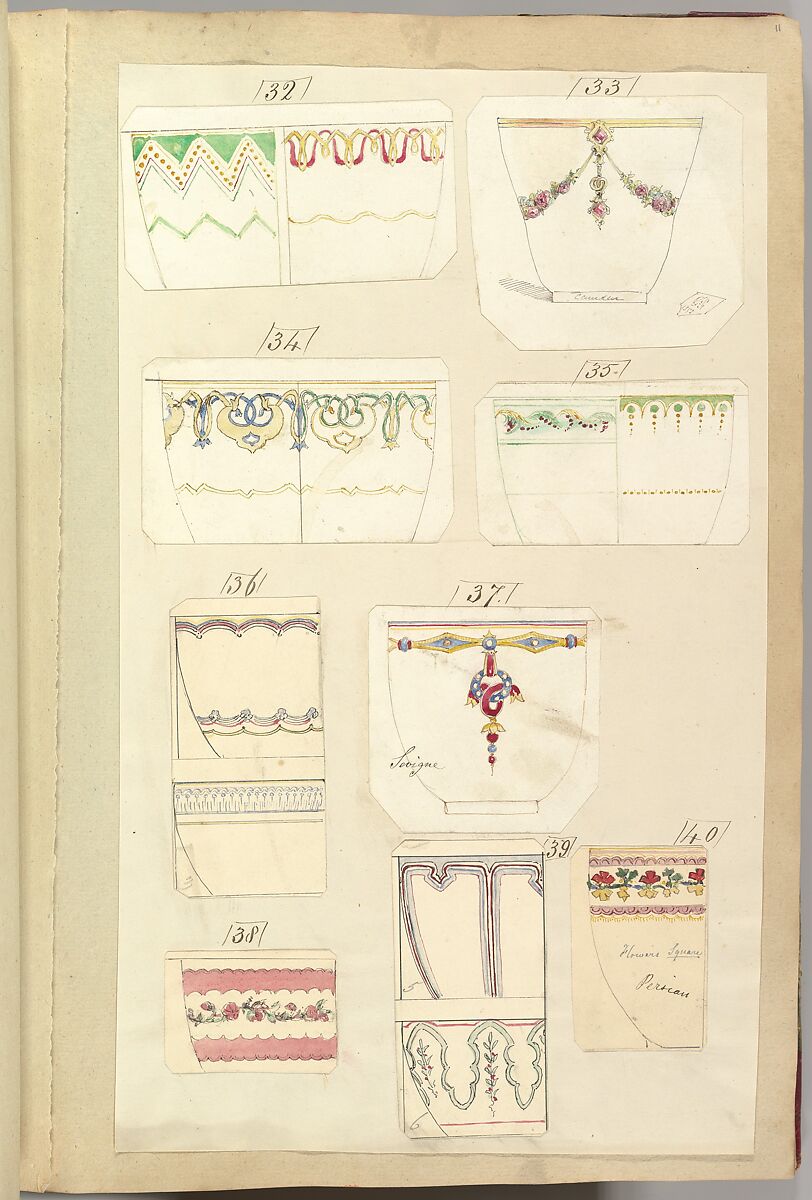 - Title: Fourteen Designs for Decorated Cups, including "Camden", Sevigne" and "Persian" Patterns