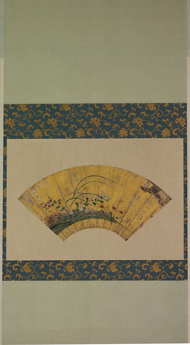 - Medium: Originally a fan mounted as a hanging scroll; ink, color, and silver on gilded paper