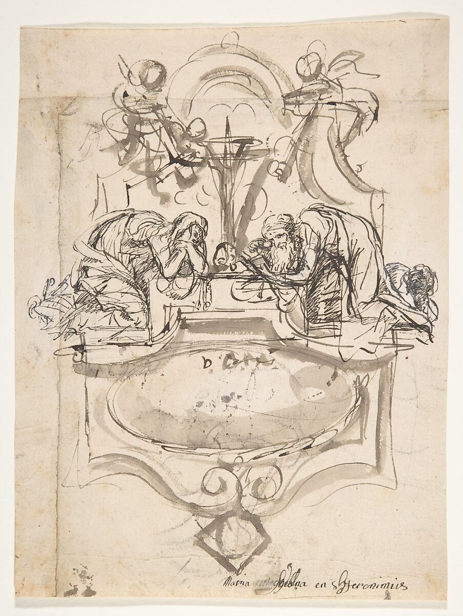 - Title: Design for a sepulchral monument with Mary Magdalen and Saint Jerome (recto); Sketch (counterproof) and writing exercises (verso)