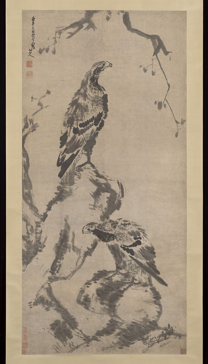 After decades spent concealing his identity as a descendant of the Ming royal house, Bada Sharen, at the age of seventy-six, seems in this forceful depiction of eagles to be declaring his proud defiance of Manchu Qing rule. There is no immediate precedent for such imagery; instead, the painting harks back to the powerful representations of eagles and hawks created by the early Ming court artist Lin Liang (ca. 1416–1480). Lin's heroic birds are emblems of strength and courage suitable for presentation to military officials. Bada, a fervent Ming loyalist, has personalized this imagery, transforming the conventional symbolism into an expression of brave confrontation and unfaltering loyalty, his noble birds standing sentinel over a landscape now occupied by foreign conquerors