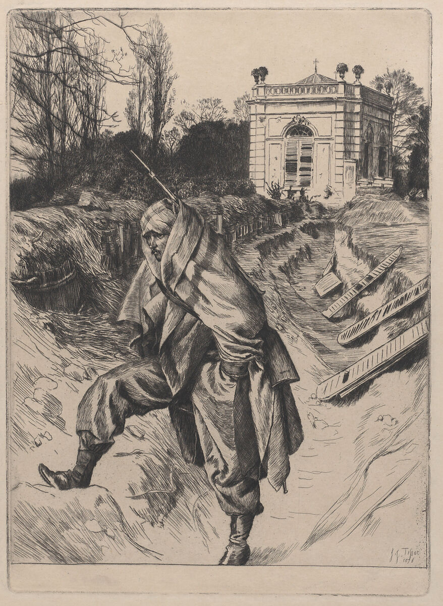 Tissot enlisted in the National Guard to defend the city of Paris during the Prussian siege in 1870. This is one of a series of six etchings he produced later in the decade, all subtitled "Souvenir du Siege de Paris" and based on drawings he made during the conflict. Thomas Gibson Bowles, the editor of "Vanity Fair," based a wood engraved illustration for his book, "The Defense of Paris: Narrated As It Was Seen" (1871) on the same now-lost drawing.