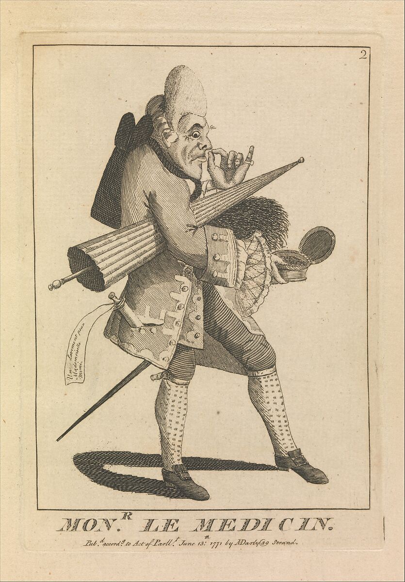 This fashionable French doctor comes from a set of twenty-four caricatures that Matthew and Mary Darly published in 1771. A husband-and-wife team, the Darlys developed a new British print genre--small etched caricatures of single figures against plain backgrounds, their identities indicated through dress, pose and a few props. Many of these works mocked the fashionable manners of contemporary London dandies called "macaronis," and the Darly's wares soon became known as macaroni prints no matter what their subjects. The implied Italian connection was in fact appropriate, since the basic form was inspired by Ghezzi's caricature drawings brought back from Rome by Grand Tourists. The form and subjects adapted by the Darlys tickled British tastes and broadened the scope of Ghezzi's works to include a range of social classes, known figures, and types. This image may have been designed by the skilled amateur Henry William Bunbury.
