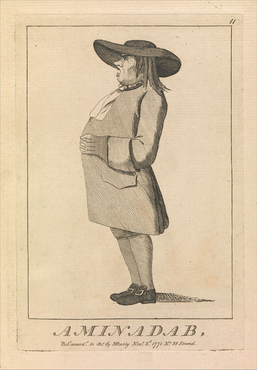 This image comes from a set of twenty-four caricatures that Matthew and Mary Darly published in 1771. A husband-and-wife team, the Darlys developed a new British print genre--small etched caricatures of single figures against plain backgrounds, their identities indicated through dress, pose and a few props. Many of these works mocked the fashionable manners of contemporary London dandies called "macaronis," and the Darly's wares soon became known as macaroni prints no matter what their subjects. The implied Italian connection was in fact appropriate, since the basic form was inspired by Ghezzi's caricature drawings brought back from Rome by Grand Tourists. The form and subjects adapted by the Darlys tickled British tastes and broadened the scope of Ghezzi's works to include a range of social classes, known figures, and types. his man's dress suggests that he is a dissenting preacher.