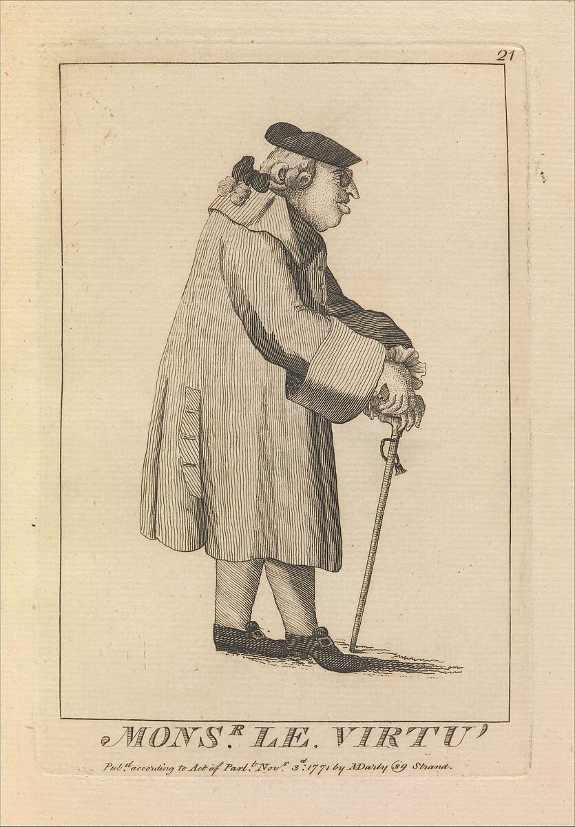 This image comes from a set of twenty-four caricatures that Matthew and Mary Darly published in 1771. A husband-and-wife team, the Darlys developed a new British print genre--small etched caricatures of single figures against plain backgrounds, their identities indicated through dress, pose and a few props. Many of these works mocked the fashionable manners of contemporary London dandies called "macaronis," and the Darly's wares soon became known as macaroni prints no matter what their subjects. The implied Italian connection was in fact appropriate, since the basic form was inspired by Ghezzi's caricature drawings brought back from Rome by Grand Tourists. The form and subjects adapted by the Darlys tickled British tastes and broadened the scope of Ghezzi's works to include a range of social classes, known figures, and types. This etching of a man leaning on a cane as though examining a work of art represents the picture dealer Dr. Robert Bragge.