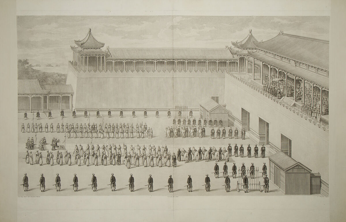 Part of a set of sixteen, "Pioneers Presented to the Emperor" was commissioned by the Qianlong Emperor in 1765 to commemorate Manchu victories (1755-59) over the Eleuths, the Dzungars, and other Central Asian peoples in the present-day region of Xinjiang. Made under the direction of Charles-Nicolas Cochin (1715-1790), the prints, which follow reduced-scale copies of paintings by Jesuit artists working in Beijing, were etched and engraved in France from 1767 to 1774 by the finest printmakers at the court of Louis XV. The Chinese merchants of Canton (present-day Guangzhou) paid for the copper plates and two hundred sets of prints to be delivered to China, with only a few sets retained in Paris.