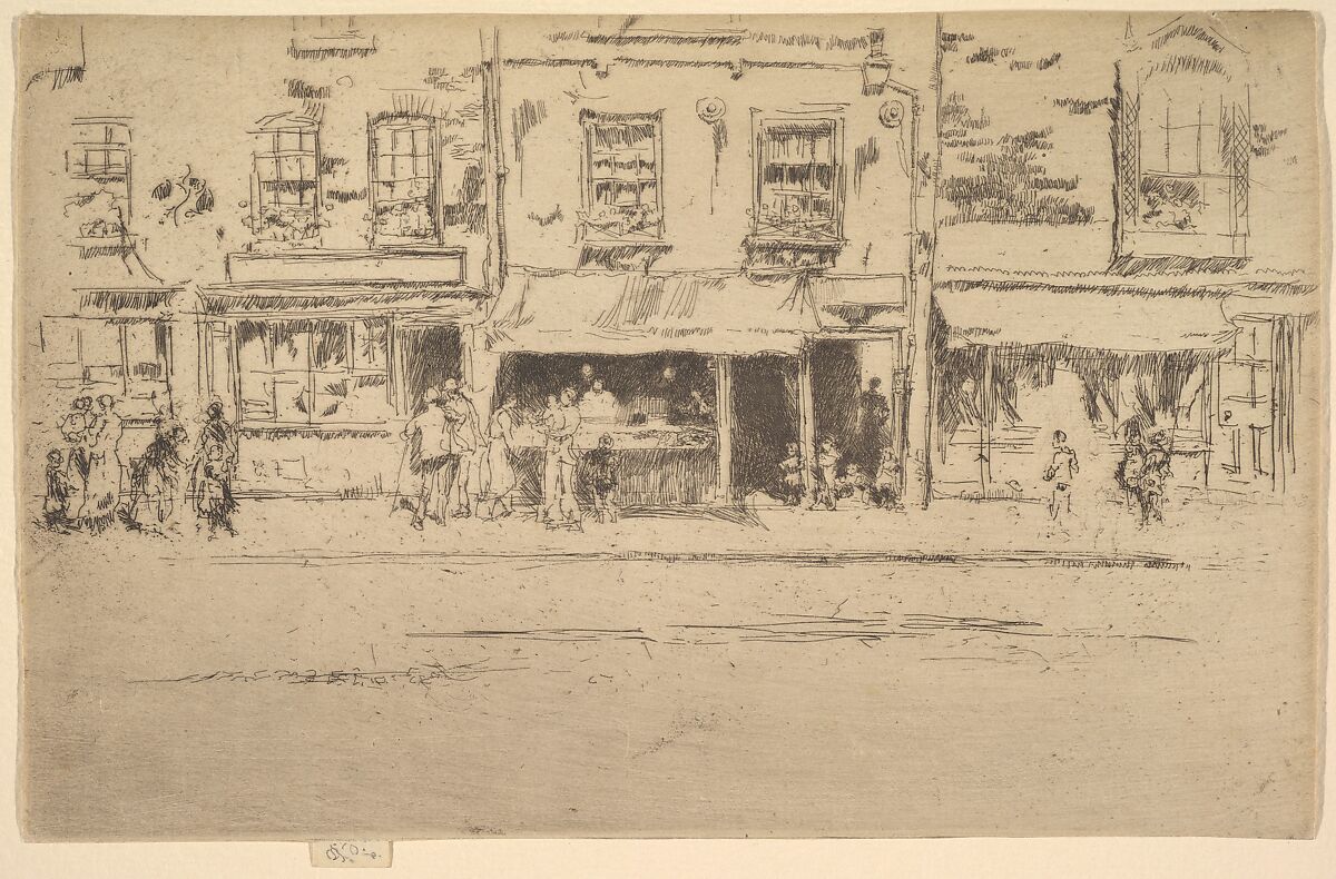 After returning to London from Venice, Whistler made a number of prints devoted to the shop fronts of small vendors operating in old buildings. Here, the windows, awnings, and piled counters of Elizabeth Maunder’s fish shop on Cheyne Walk, near the artist’s Chelsea residence, are used to develop an abstracted pattern of lights and darks. Supported by the architecture, the horizontal arrangement is punctuated by pedestrians and shop assistants, some standing within shadowed doorways, others on the brightly lit sidewalk.