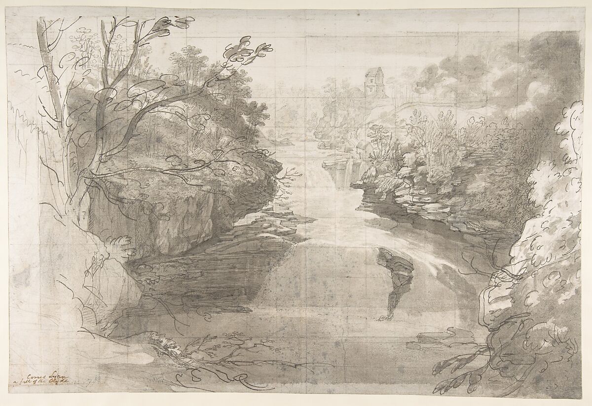 Farington’s expressive study centers on a waterfall in Lanarkshire, Scotland (linn is Gaelic for "falls"). Squared for transfer, it was intended as the foundation for a finished work and includes techniques that range from freely applied pen and ink (for foreground foliage), brush and wash (to describe shade), and graphite (for the falls). Reserved paper indicates light falling from the left and represents patches of moving water. Few English artists explored Scotland at this date, but Farington sketched along the rivers Forth and Clyde in the summer of 1788 to design aquatints for an anticipated concluding volume of The History of the Principal Rivers of Great Britain. Unfortunately, the French Revolutionary Wars affected the print trade and these Scottish views were never published.