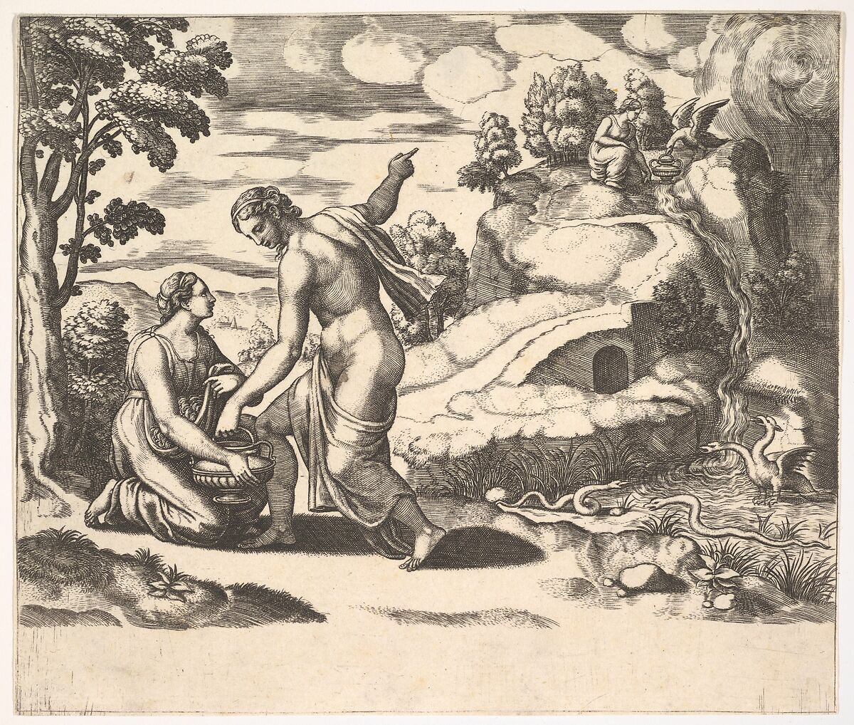 - Title: Venus ordering Psyche to take water from a fountain guarded by dragons, from 'Fable of Cupd and Psyche'