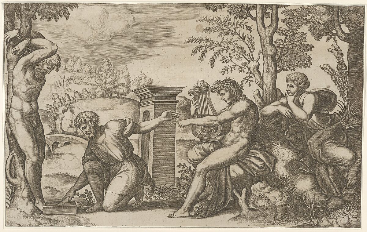 Apollo seated at the right with a lyre, pointing to a kneeling man who is about to flay Marsyas tied naked to a tree at left