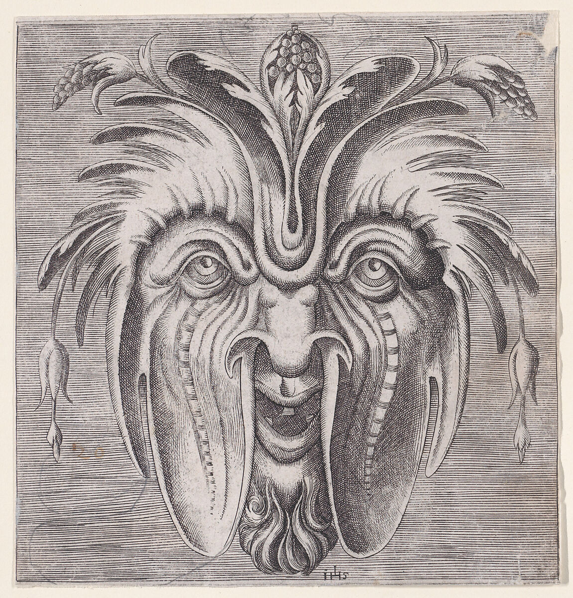Various copies were soon made after the series by Floris and Huys, demonstrating the popularity of such masks across Europe. This print belongs to an Italian set of twenty-four signed with the monogram IHS. In addition to copies after Floris, the set included six original designs. It was likely acquired by the French printmaker René Boyvin, who published the designs under his own name with a title page. Boyvin himself produced numerous prints inspired by the decorations at Fontainebleau for an expanding market of artists and collectors.