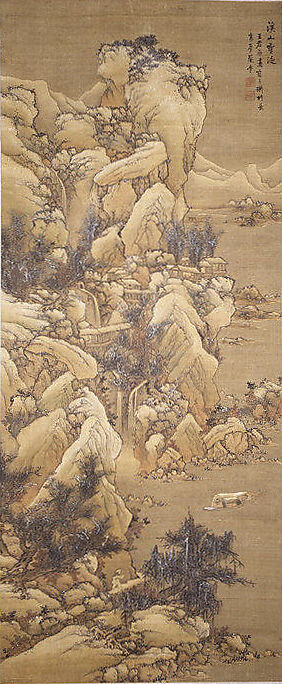 Lan Meng's extant paintings date from 1643 to 1671; during the mid-1660s, he worked in the capital city of Beijing, where this painting was created. Snowscapes, featuring white pigment highlights on tree branches, were a particular specialty. Typically, Lan Meng attributed his inspiration to the Tang-dynasty poet-painter Wang Wei (699–759), whom the late Ming painter and critic Dong Qichang (1555–1636) regarded as the patriarch of scholar painting. But no reliable work by Wang had survived into the seventeenth century. Instead, Lan Meng evoked his memory by combining a tenth-century composition—tall mountains alongside a deep recession—with a landscape idiom derived from the scholar-painter Huang Gongwang (1269–1354).
