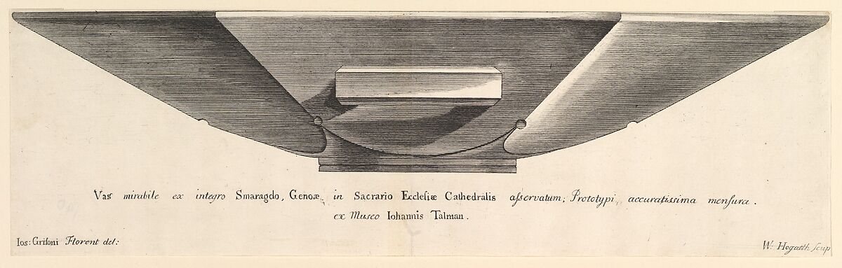 Hogarth made this print early in his career to illustrate a travel book by the French author Aubry de La Mottraye. The related text notes that this emerald vessel preserved at Genoa in the cathedral, was believed to have been given to Solomon by the Queen of Sheba, and then used by Christ at the Last Supper.