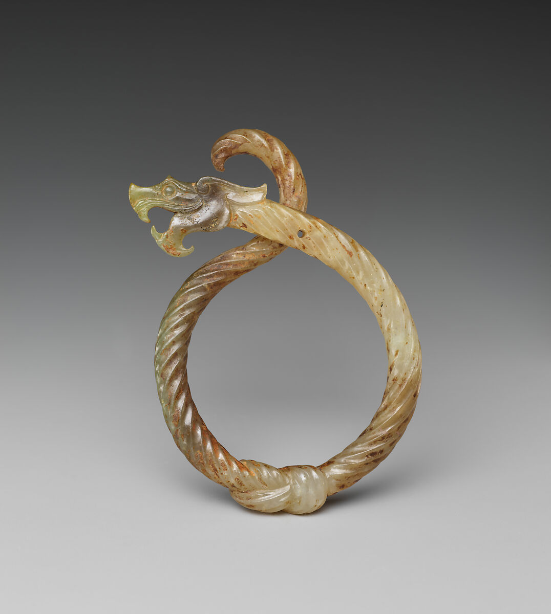 This pendant takes the shape of a dragon with a sinuous body grooved to resemble twisted rope. Its elegant curves illustrate the extraordinary talent and skill of early Chinese jade carvers, in whose hands hard, intractable jade seems a supple and malleable material.