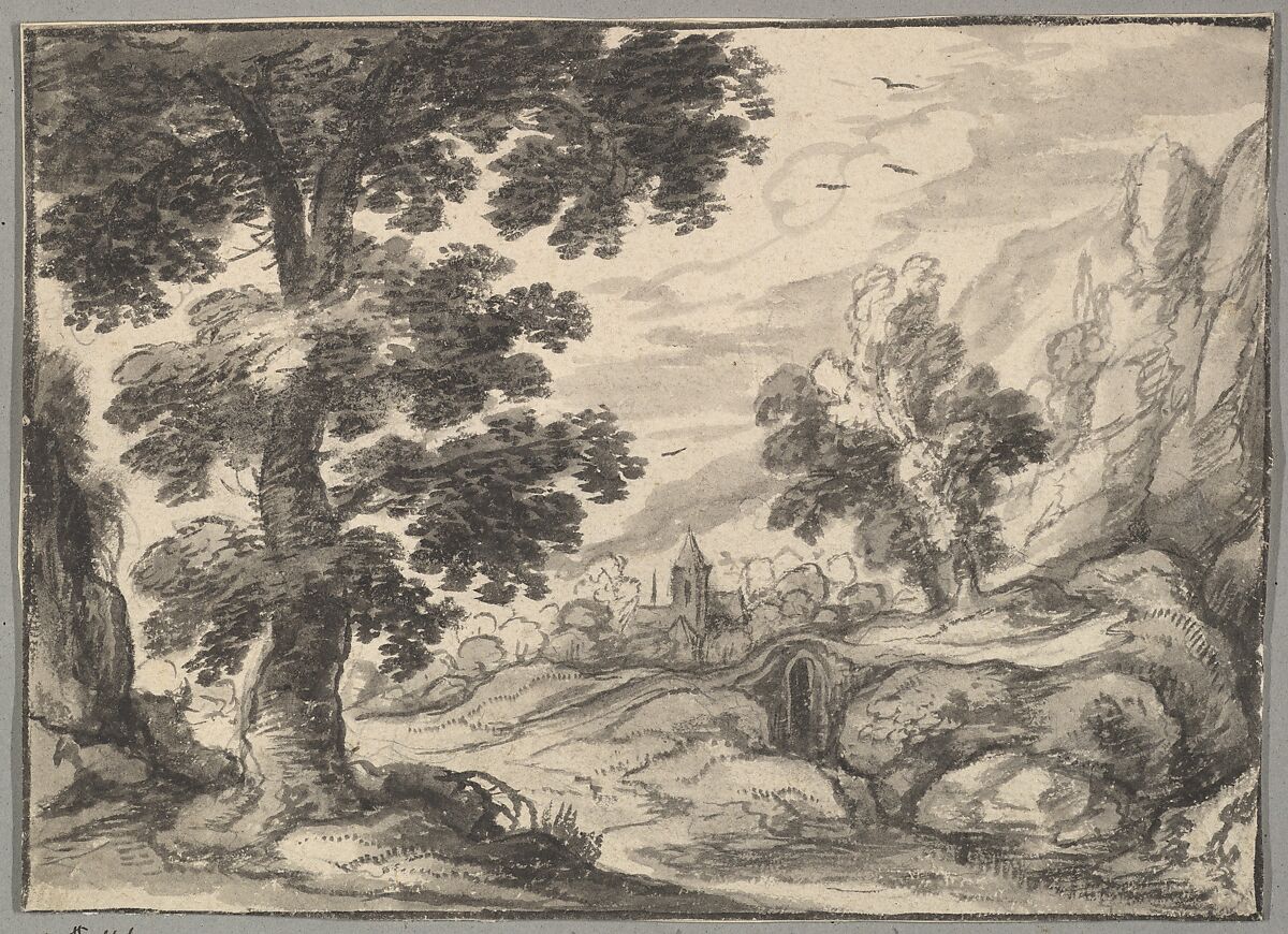 - Medium: Brush and gray wash, over black chalk; framing lines in brush and gray wash