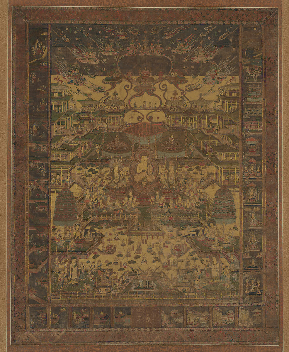 The Taima Mandala represents the Pure Land of Amida Buddha and is bordered on three sides by parables from the Sutra on the Meditation on the Buddha of Infinite Life (Kanmuryō jukyō). This text recounts the promise at the core of Pure Land School teaching: that those who concentrate on the Buddha Amida, and recite his name will be escorted to his blissful paradise at the moment of death. The painting depicts an enormous palace with a golden pond presided over by Amida and his retinue. Musicians, dancers, and thirty-seven types of celestial beings fill the skies and pavilions. Those born into the Pure Land emerge from lotus buds in the water. The parables tell the story of Queen Vaidehi, who achieved birth there by performing sixteen meditations presented to her by Amida. The scenes along the bottom represent the nine levels of birth. This type of mandala was introduced to Japan from China in the 700s along with teachings about Amida’s Pure Land.