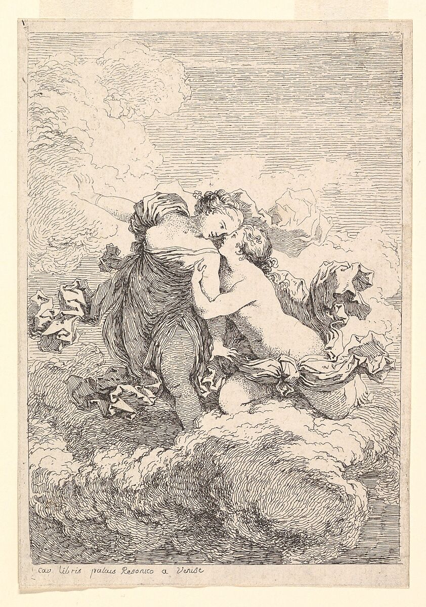 This etching is from a group of sixteen made by Fragonard in Paris around 1763-64, based on black chalk drawings he had made in Italy a few years earlier for his friend and patron, the abbé de Saint-Non. Of the sixteen, ten were based on Venetian models, including this print inspired by a painting by the seventeenth-century artist Pietro Liberi (Italian, 1605/14-1687). Liberi's canvas, today in the Royal Collection Trust (RCIN 405705) is more closely cropped; Fragonard added space above and below the figures to create a more airy composition.