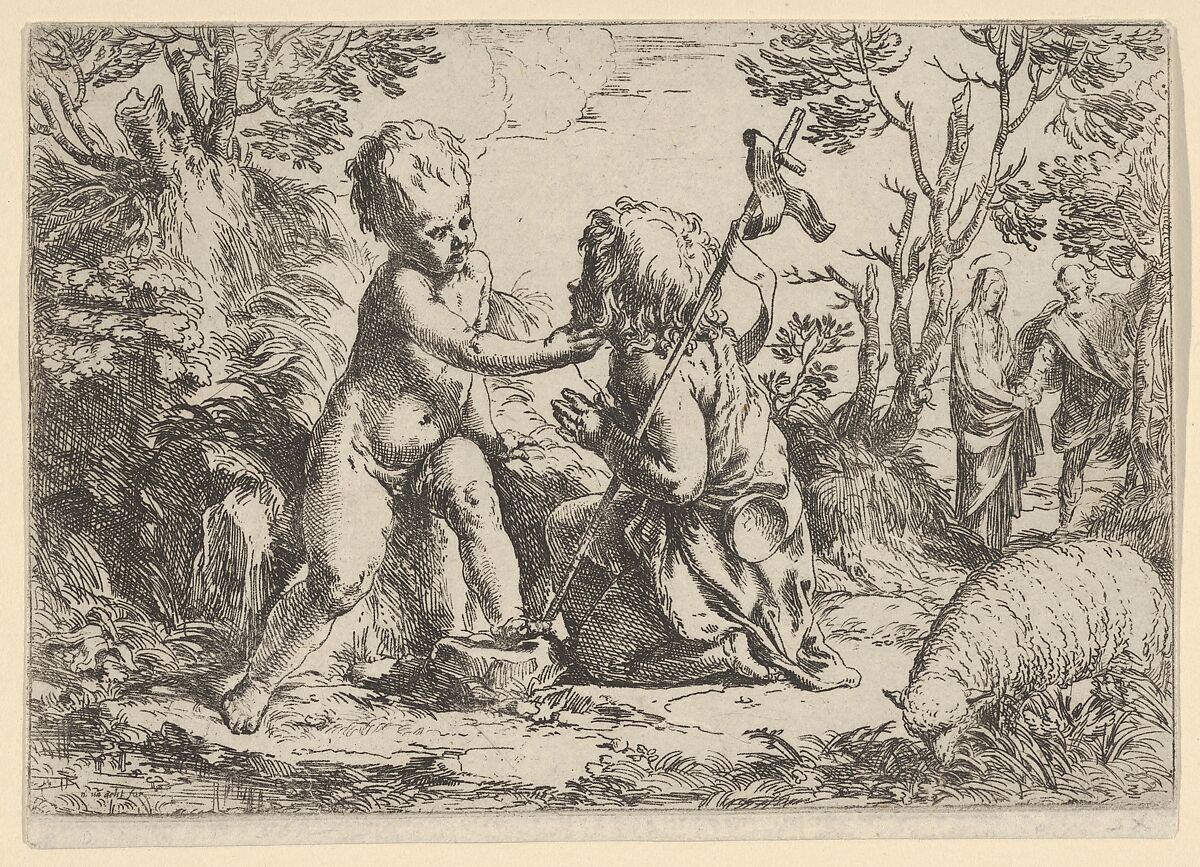 - Title: Young Saint John the Baptist kneeling before the infant Christ who caresses his face, the Virgin and Joseph in the background at right