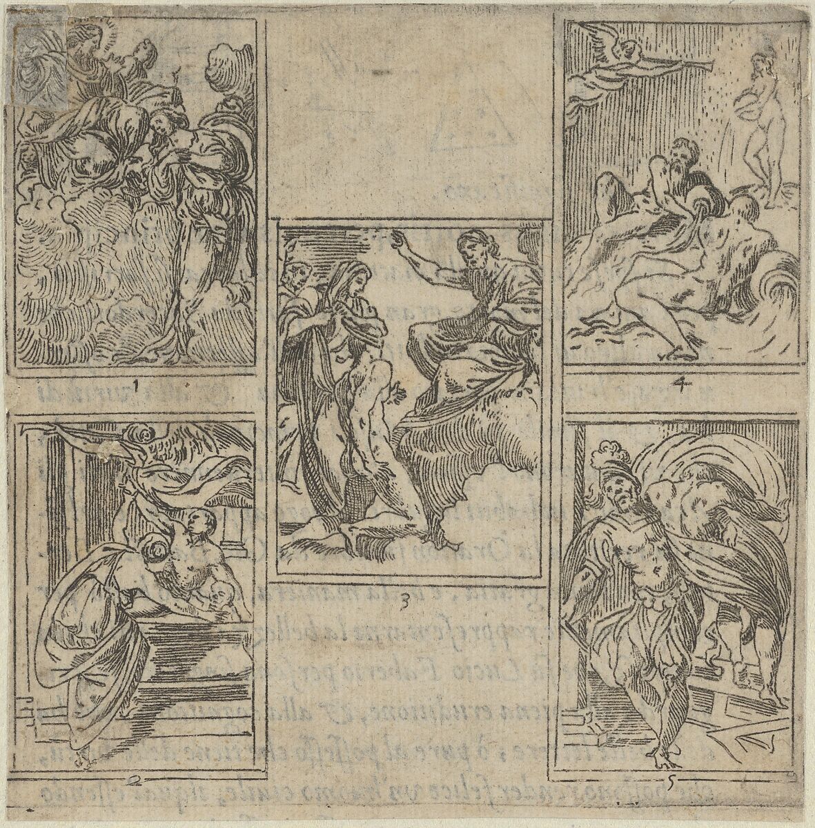 Five numbered scenes, each after a painter in the Accademia Degl'Incamminati, from IL FUNERALE D'AGOSTINO CARRACCIO FATTO IN BOLOGNA SUA PATRIA DAGL'INCAMINATI Academici del Disegno: 1. Ceres lamenting the death of Carracci before Jupiter, painted by Ippolito Ferrantini; 2. Personification of Painting entrusting Carracci's body to Fame, painted by Giovanni Battista Bertusi; 3. The Fates leading the blindfolded Carracci to the foot of Jupiter's throne, painted by Lucio Massari; 4. Three rivers representing the cities of Bologna, Rome and Parma (Reno, Tiber and Parma) with Fame at left, designed by Sebastiano Razzali and painted by Baldessare Aloisi Galanini; 5. Agostino Carracci abducted by Mars who is jealous of the artist's portrait of Adonis made for a Farnese gallery panel, painted by Giovanni Battista Busi.