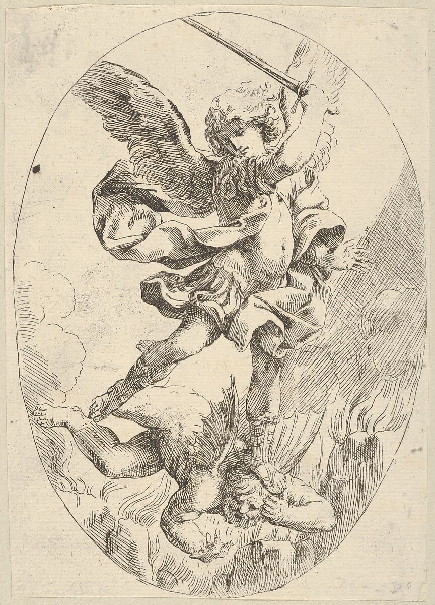 The winged archangel Saint Michael holding a sword and standing on the head of the devil, who descends into hell, an oval composition