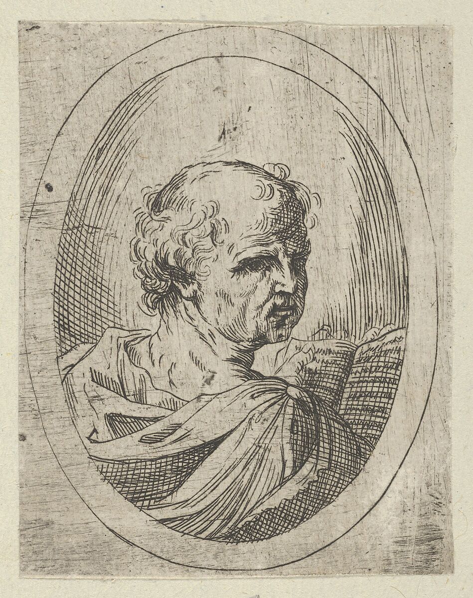 From Christ, the Virgin and Thirteen Apostles, a series of fifteen busts in oval frames printed from one plate, after Reni. Verso not visible as print is laid to another sheet of paper.