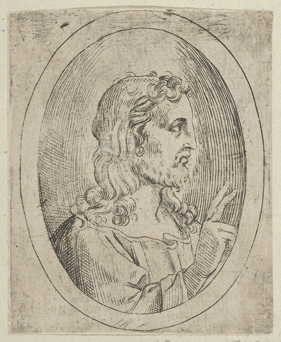 - Title: Christ seen in profile facing right, making the sign of blessing with his right hand, in an oval frame, from "Christ, the Virgin, and Thirteen Apostles"