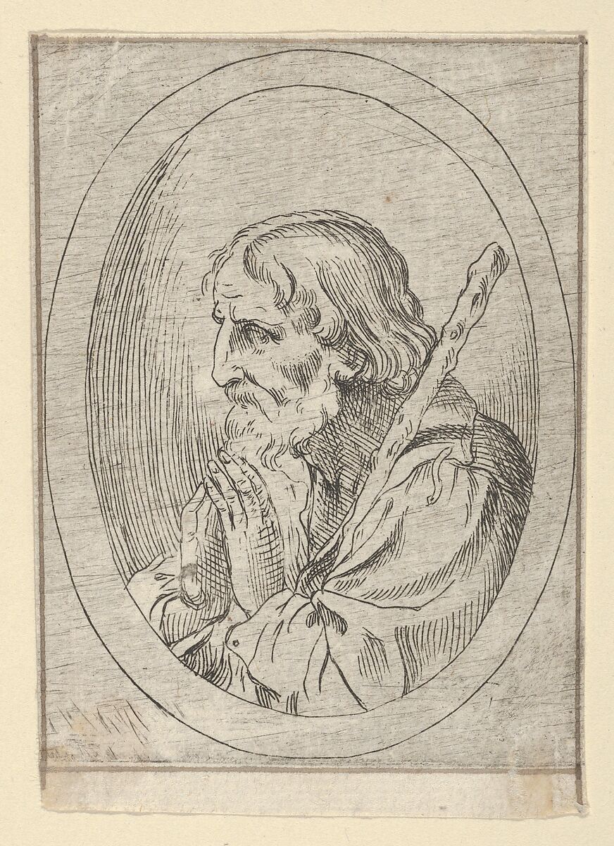 - Title: Saint Jude in prayer, seen in profile facing left with a staff resting on his shoulder, in an oval frame, from "Christ, the Virgin, and Thirteen Apostles"