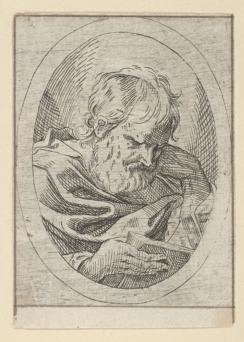 - Title: An apostle resting his head on his left hand and reading a book, in an oval frame, from "Christ, the Virgin, and Thirteen Apostles"