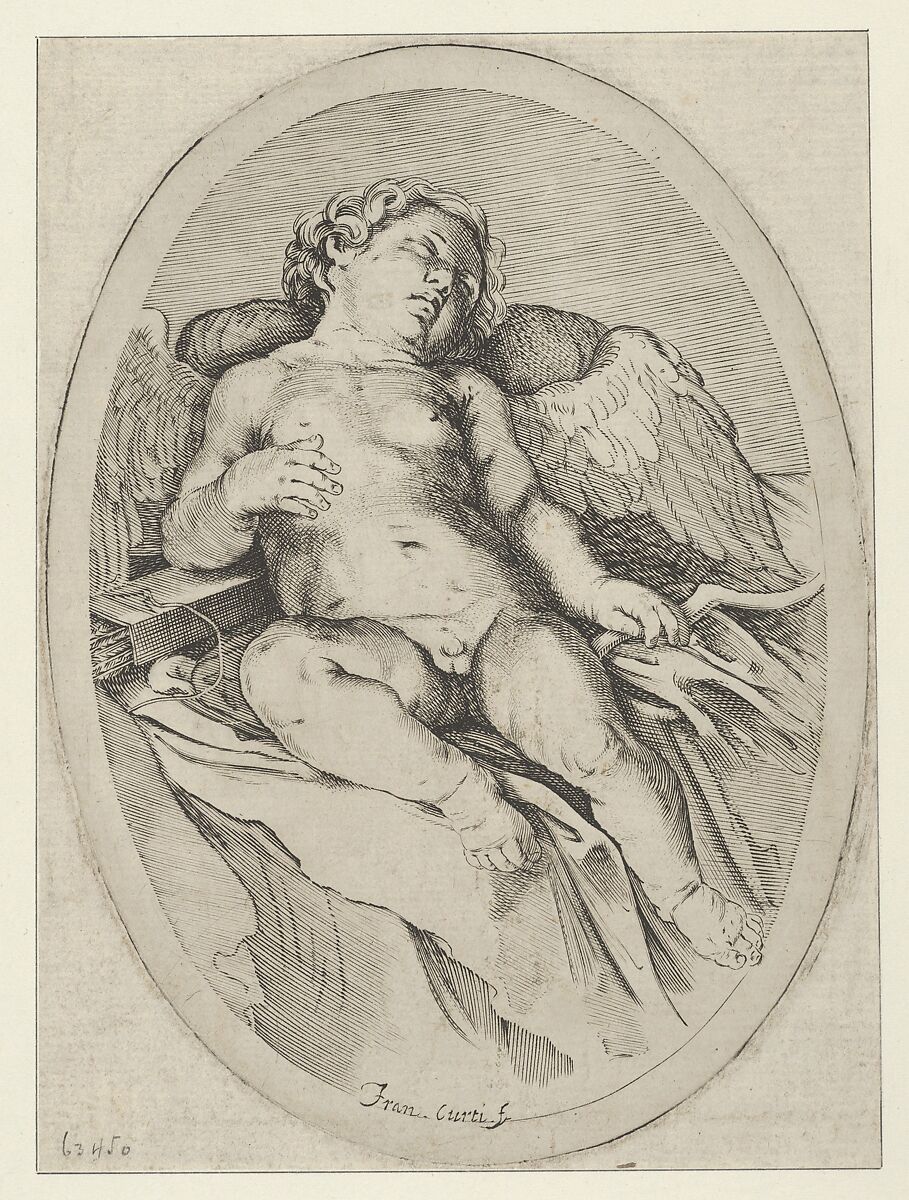 - Title: Cupid asleep, resting his right arm on his quiver and his left arm on his bow, an oval composition, after Reni