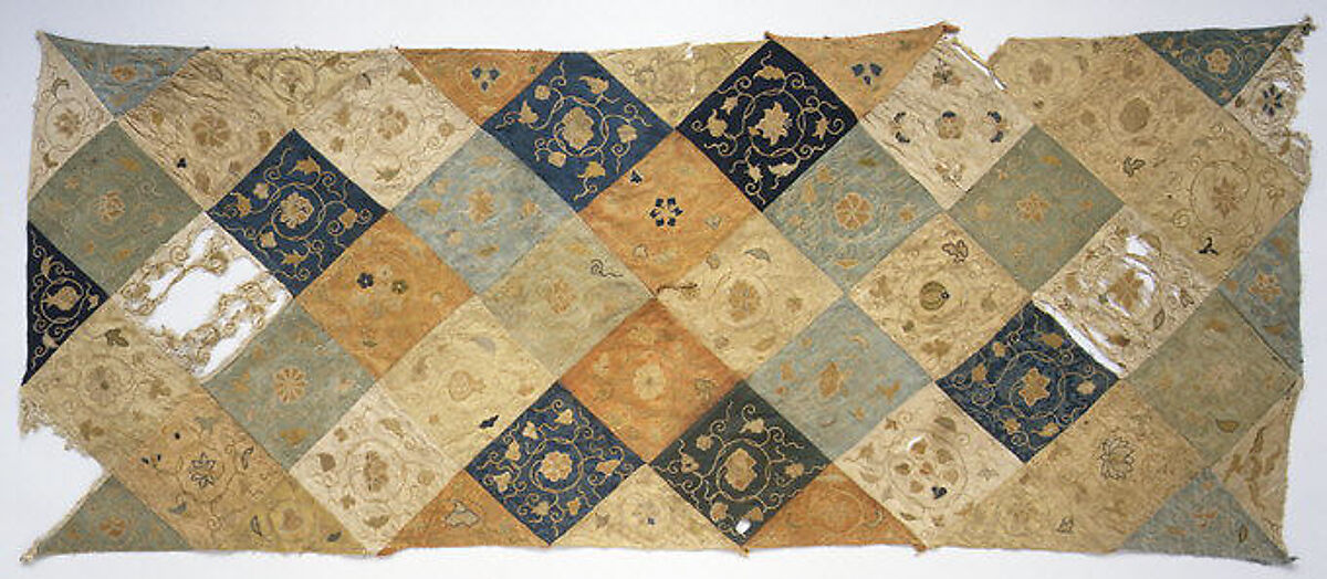 This patchwork panel comprises various silk textiles, mostly satins and damasks, exquisitely embroidered with the motifs of flowers, fruit, and the occasional butterfly in a technique called needle looping. Worked in silk over gilt paper, the technique allows the luminous gold to show where loops are intentionally skipped. The patches in this Chinese example seem to have been constructed and embroidered as self-contained units that were stitched together to form a larger panel. By contrast, Korean patchwork cloths are usually fashioned from fragments of unadorned, rather than embroidered fabrics, though there are non-patchwork bojagi fashioned from a single cloth with embroidered decoration.