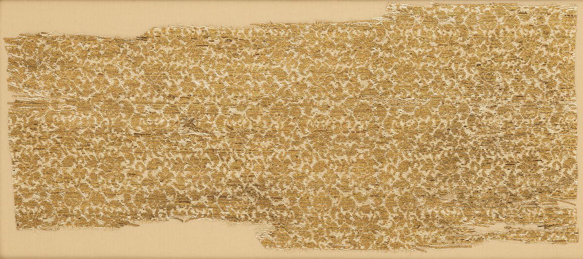 Central Asian silks with small dense patterns in gold were part of the international trade that flourished under the Mongols, and most known examples survive in European church treasuries. This piece was part of a liturgical vestment long associated with Pope Benedict XI (d. 1304). Textiles such as these were also depicted in Italian—particularly Sienese—paintings, for example Simone Martini's Annunciation of 1333.