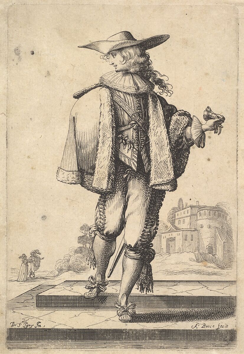 - Title: A gentleman walking forward, his face in profile to the left, holding his glove in his right hand and wearing a hat, a fur jacket, and shoes with ribbons, from "The Garden of the French Nobles In Which One Can Pick Up Their Way of Dressing"