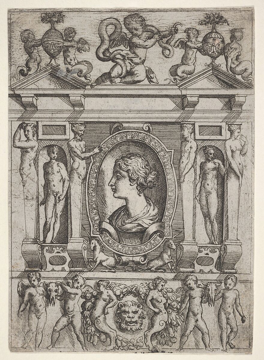 - Title: Bust of a woman in profile facing left, set in an elaborate frame with figures in niches at left and right
